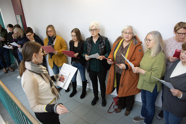 Würzburg, 05.12.2024. Zum traditionellen Adventssingen im Treppenhaus des Caritashauses haben sich am Morgen des 5. Dezember die Mitarbeiterinnen und Mitarbeiter der Geschäftsstelle getroffen. Mit weihnachtlichen Liedern und besinnlichen Texten stimmten sie sich dabei auf das anstehende Weihnachtsfest ein.