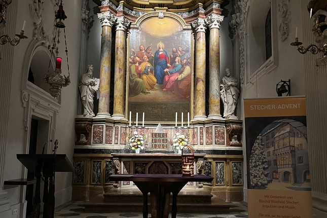 Der „Bischof Stecher-Gedächtnis-­Verein“ veranstaltet seit vielen Jahren den „Stecher-Advent“. In diesem Jahr war Domkapitular Clemens Bieber, selber Mitglied im Verein, eingeladen einen geistlichen Impuls zu halten. Angelica Ladurner (Schauspielerin, Regisseurin, Intendantin) trug aus dem Weihnachtsbuch von Bischof Stecher einen seiner Texte („Adventliche Ströme im Meer der Zeit“) vor. Clemens Bieber beschrieb seinen väterlichen Freund, der unzähligen Menschen Orientierung und Begleitung