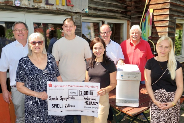 Würzburg, 31.07.2024. Die Wirts-Familie Kulinna in den Juliusspital Weinstuben hat eine Spende in Höhe von 2000 Euro an die Verantwortlichen des Kinderspielzentrums SPIELI im SkF in der Würzburger Zellerau übergeben. Das Geld stammt aus den Einnahmen der diesjährigen „Spargeltaler-Benefizaktion“.