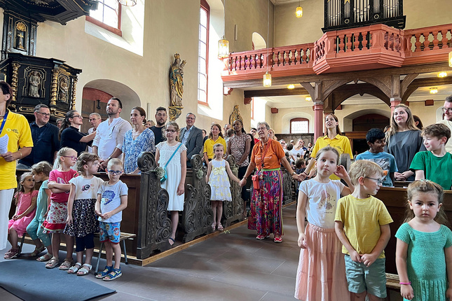 Veitshöchheim, 02.08.2024. Nach 37 Jahren als Leitung des Caritas-Kindergartens St. Bilhildis in Veitshöchheim tritt Angelika Vey-Rossellit zum Ende dieses Kindergartenjahres ihren wohlverdienten Ruhestand an. Zum Abschied kamen Groß und Klein in der Vituskirche und im Garten der Einrichtung zusammen, wo sie die Caritas-Ehrennadel in Gold erhielt.