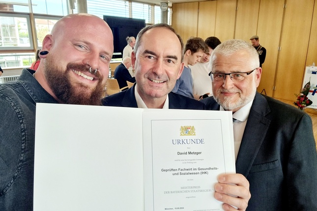 Würzburg, 04.06.2024. David Metzger, Mitarbeiter im Case Management der Begleitenden Dienste im Caritas-Don Bosco-Bildungszentrum, hat Mitte Mai aus den Händen von Bayerns Wirtschaftsminister Hubert Aiwanger den „Meisterpreis der bayerischen Staatsregierung“ erhalten. Die Auszeichnung bekam der „Geprüfte Fachwirt im Gesundheits- und Sozialwesen (IHK)“ als einer von insgesamt 73 Besten bei den IHK-Weiterbildungsprüfungen.