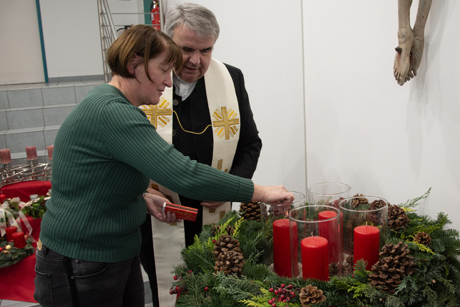 Würzburg, 29.11.2024. Wenige Tage vor dem ersten Advent hat Domkapitular Clemens Bieber den großen Adventskranz sowie die Adventskränze und -gestecke der Mitarbeitenden des Caritasverbandes bei einer kurzen Andacht im Caritashaus gesegnet.