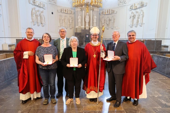Würzburg, 09.07.2024. Für vielfältiges ehrenamtliches Engagement in der Kirche von Würzburg hat Bischof Dr. Franz Jung am Montagabend, 8. Juli, beim Kiliani-Gottesdienst für Räte und Politiker drei Engagierten im Namen von Papst Franziskus das päpstliche Ehrenkreuz „Pro Ecclesia et Pontifice“ verliehen.