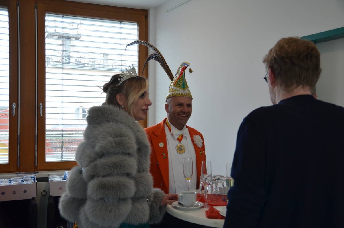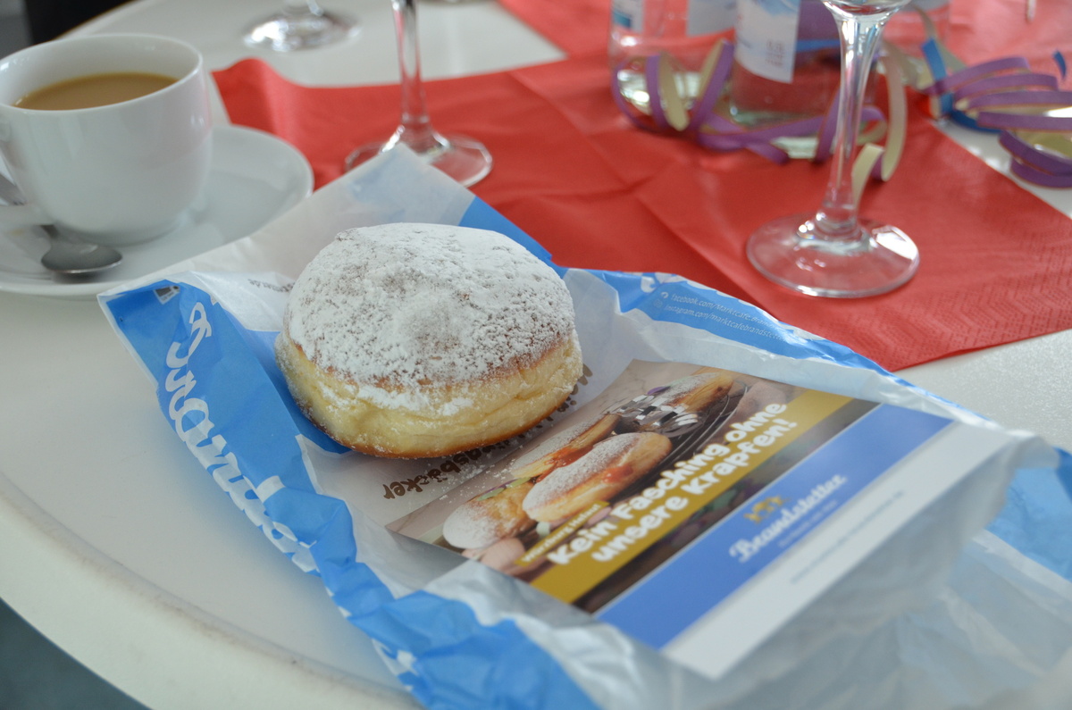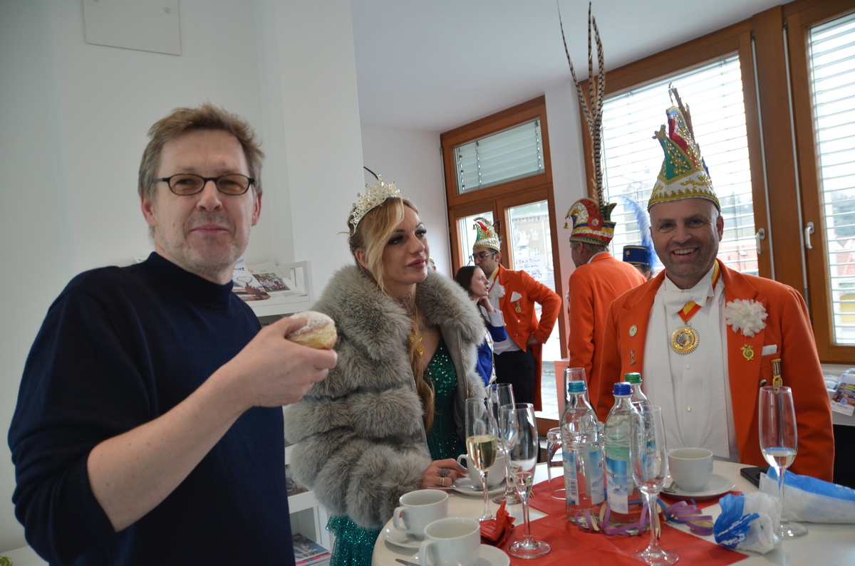 Neben den anerkennenden Worten hatten die Vertreter der Karnevalsgesellschaft auch eine süße Überraschung in Form von zwei vollen Kartons an frischen Krapfen mitgebracht. Diese durften sich die Mitarbeitenden der Geschäftsstelle nach dem Besuch der Faschingsabordnung im dritten Stock abholen und schmecken lassen.