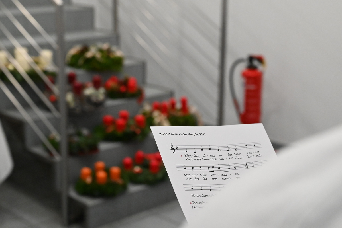 Zur Andacht mit Liedern, Texten und Gebeten versammelten sich die Mitarbeiterinnen und Mitarbeiter zur Mittagszeit im Foyer des Caritashauses in der Franziskanergasse. Bei der kurze Segnungsfeier betonte Domkapitular Clemens Bieber die Tage des Wartens und das Licht als hoffnungsvolles Zeichen. Außerdem wurden von DiCV-Mitarbeitenden Verse aus der Bibel gesprochen, deren Inhalt Lichter auch in der Finsternis leuchten lässt.