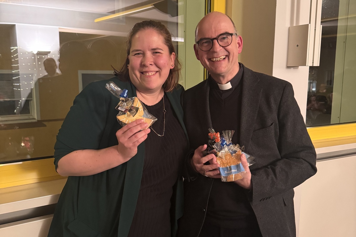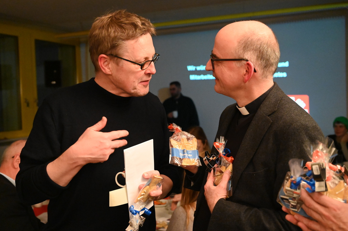 Bischof Jung, der nach dem Treffen mit den Mitarbeitenden des Bischöflichen Ordinariats ins Caritashaus kam, betonte die weitere Verzahnung von Caritas und Pastoral. Das Bewusstsein gemeinsam unterwegs zu sein, sei gewachsen. Zum anstehenden Heiligen Jahr gab er den Impuls weiter „Orte der Hoffnung“ zu definieren. Zudem rief Jung zur Beteiligung am Katholikentag 2026 auf. „Ganz herzlichen Dank für alles, was geleistet worden ist, in den vielen Tätigkeitsfeldern der Caritas. Danke für Ihr beispielhaftes Tun!“, sagte er. Im Anschluss teilte der Bischof als Dank gebackene süße Engelchen aus und wünschte ein „gesegnetes neues Jahr der Hoffnung“.