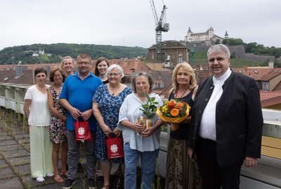 Heike Sterzinger-Allaham und Jutta Gaubitz feierten kürzlich ihren 60. Geburtstag. Anlässlich ihrer runden Geburtstage gratulierten Domkapitular Clemens Bieber und die Mitglieder der Leitungskonferenz und überreichten einen bunten Blumenstrauß beziehungsweise einen Blumenstock. Zudem verabschiedeten die Mitglieder der Leitungskonferenz zwei Mitarbeitende aus der Dienstgemeinschaft: Roland Elsdörfer, der seit fast 40 Jahren im Caritasverband für die Diözese Würzburg e. V. ist, wird die Geschäftsstelle verlassen und sich neuen beruflichen Tätigkeiten im großen Netzwerk der Caritas zuwenden. Iris Pfister war zehn Jahre lang beim DiCV und zuvor lange bei der Diakonie aktiv. Sie verabschiedet sich nun in den Ruhestand. Beide freuten sich über einen Bocksbeutel als Dank für ihren Einsatz.