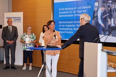 Eine Fachjury hatte zunächst aus einigen hundert Bewerbungen zum Ehrenamtspreis der Versicherungskammer Stiftung besonders beeindruckte Engagements für das Online-Voting nominiert. Die Bahnhofsmission Schweinfurt ist mit den Angeboten Mobile Reisbegleitung, Stadtteil-Café und Männerfrühstück in die Ausschreibung gestartet. Jetzt kann sie sich über 1 000 Euro Preisgeld freuen – ebenso wie die beiden anderen Preisträger: die Rettungshundestaffel Kaiserslautern und die Initiative Lacrima in München. Die Verleihung fand am 15. Juli im Rahmen eines Ehrenamtssymposiums in München statt.