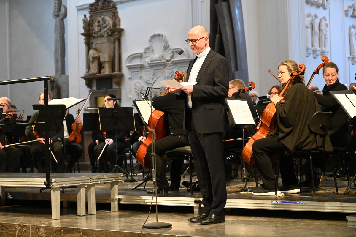 Bischof Jung fragte zu Beginn: „Klassische Musik und Bahnhofsmission, passt das zusammen?“ In seinem Dienst als Ehrenamtlicher der Bahnhofsmission Würzburg begegne ihm weniger Harmonie als vielmehr „Menschen, die unter den Dissonanzen ihres Lebens leiden“. Ihnen leiste die Bahnhofsmission als „Hoffnungsort unserer Stadt“ an 365 Tagen im Jahr rund um die Uhr Hilfe. „Danke, dass Sie mit ihrem Kommen die Bahnhofsmission unterstützen“, bedankte sich Jung beim Publikum.