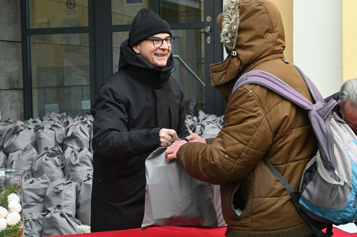 Bevor die Feier bei einer warmen Mahlzeit, Getränken und Plätzchen ausklang, verteilten Bischof Jung und Vereinsvorsitzender Lehrieder gut gefüllte Geschenkbeutel an die Anwesenden. Mit Hilfe großer und kleiner Spenden von Firmen und Privatleuten hatte man beim Förderverein Wärmestube allerhand Nützliches in die Beutel gefüllt, wie etwa Tee, Wollsocken oder Weihnachtsgebäck. Der Bischof wünschte den Frauen und Männern bei der Übergabe jeweils ein „Frohes Weihnachtsfest“ – als Antwort kam herzliches „Dankeschön“ zurück.