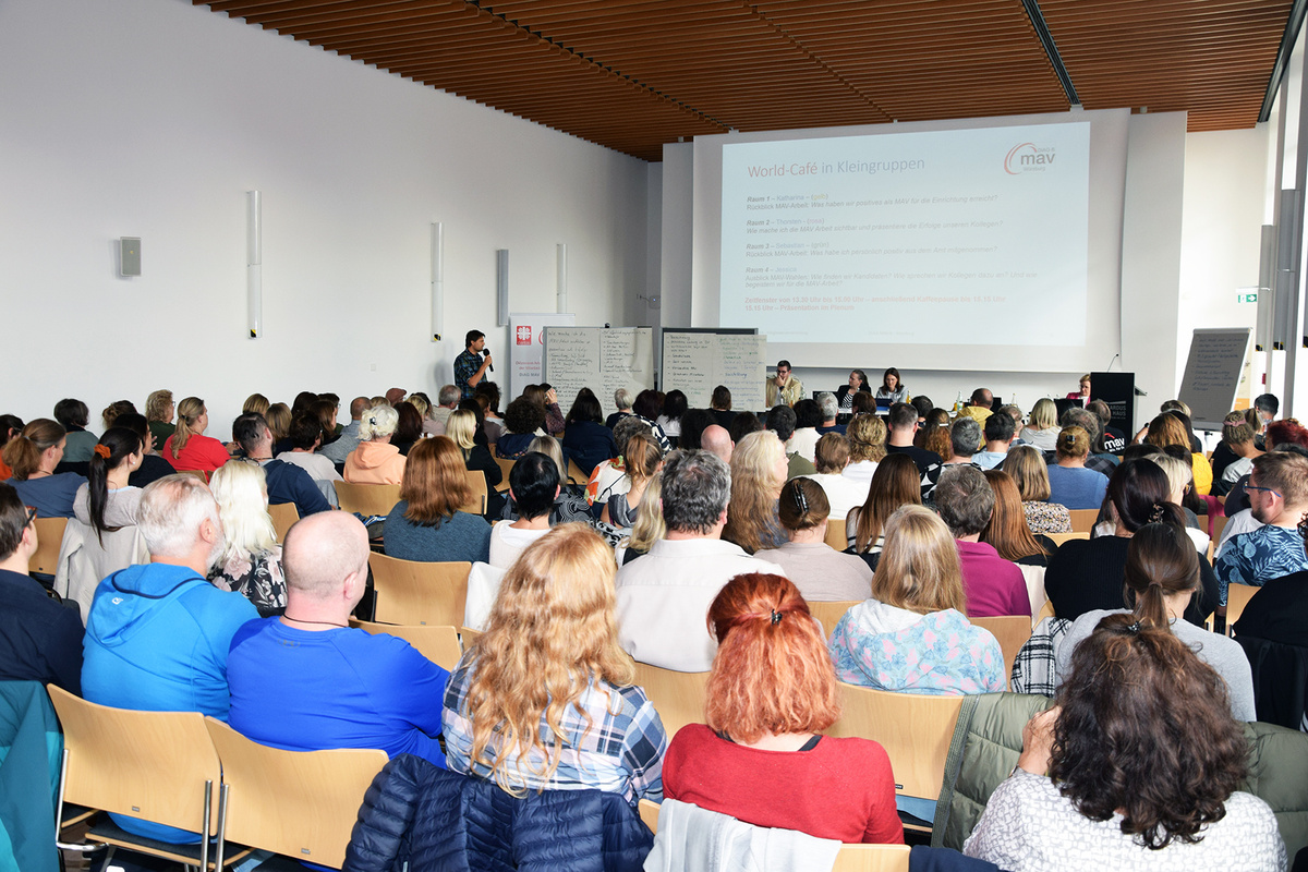 Im Rahmen von Workshops erarbeiteten die Teilnehmer in Gruppen wichtige Fragen zur Sichtbarkeit und Wirksamkeit der MAV-Arbeit in ihren Einrichtungen. Dabei wurde schnell deutlich, wie viele positive Effekte die Mitarbeitervertretungen bereits erzielt haben und wie wichtig es ist, neue Kandidaten für die kommenden Wahlen zu gewinnen.