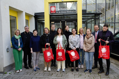 Im Anschluss an die Begrüßung der neuen Mitarbeitenden der Geschäftsstelle erhielten die neuen Kolleginnen die roten Caritas-Taschen, die traditionell mit allerlei Nützlichem und Wissenswertem rund um die unterfränkische Caritas gefüllt sind. Zudem überreichte Sabine Werner im Namen der Mitarbeitervertretung (MAV) an alle eine Tafel Schokolade: „Auch ich begrüße Sie im Namen der Mitarbeitervertretung und im Namen der Kolleginnen und Kollegen herzlich bei uns. Sollten Sie Fragen oder Anregungen haben, kommen Sie immer gerne auf uns zu. Die MAV hat jederzeit ein offenes Ohr“, so die DiAG-MAV B-Vorsitzende.