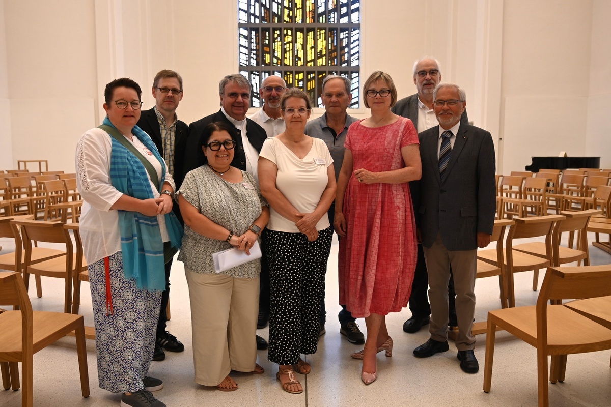 Marion Hammer vom O/KCV Schweinfurt ist Koordinationsleiterin des „casa Vielfalt“ und damit vor allem zuständig für die einrichtungsübergreifende Zusammenarbeit. Sie hatte eine Führung durch das Gebäude mit Caritasvertreterinnen und -vertretern, Mitgliedern der Stadtpfarrei Heilig Geist Schweinfurt, Kooperationspartnern sowie Politikerinnen und Politikern für die DCV-Präsidentin organisiert. Los ging es im zentralen Kirchenraum, dem Höhepunkt des Baus, wie der am Umbau maßgeblich beteiligte Kirchenpfleger Ottmar Prell und Kilian Hartmann, Vorsitzender des O/KCV Schweinfurt, unterstrichen. Domkapitular Clemens Bieber, Vorsitzender des Caritasverbandes für die Diözese Würzburg, betonte die besondere Atmosphäre des schlichten Kirchenraums, der „geistliches Zentrum“ des Hauses sei.