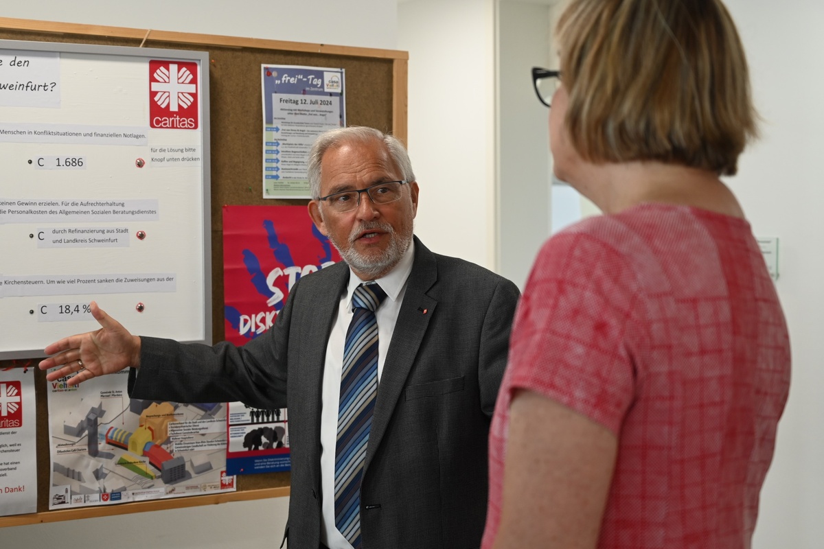 „Hier ist vieles von dem realisiert, was ich mir für die Caritas in Zukunft wünsche“, sagte Welskop-Deffaa bei einem Rundgang durch das Gebäude nördlich der Schweinfurter Innenstadt. Das alte Gotteshaus war von 2018 bis 2022 zu einer modernen Begegnungsstätte umgebaut worden. Seither hat im „casa Vielfalt“ neben Kirchenstiftung und -gemeinde der Caritasverband für die Stadt und den Landkreis Schweinfurt (O/KCV Schweinfurt) seinen Sitz. Mehrere soziale Projekte und Beratungsstellen sind dort beheimatet, darunter etwa der Allgemeine Soziale Beratungsdienst (ASBD) der Caritas und der Hospizdienst der Malteser. So wirken Pastoral und Caritas zusammen.