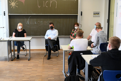 Pädagogin Tanja Hofbeck führte Dusel und die kleine Gruppe durch einige Bereiche der Berufsschule, die barrierefrei bestens gerüstet sei für diverse Herausforderungen. Jürgen Dusel, von Geburt an stark eingeschränkt im Sehvermögen, zeigte sich beeindruckt vom architektonisch gut durchdachten Konzept. Exemplarisch führte der Rundgang in die Bereiche Holz- und Frisörhandwerk, bevor Dusel das Gespräch mit Jugendlichen im Berufsvorbereitungsjahr (BVJ) suchte. Die jungen Frauen und Männer hatten viele Fragen an den Beauftragten der Bundesregierung. Schließlich ermutigte Jürgen Dusel: „Vertrauen Sie auf sich. Jeder Mensch hat etwas, das er gut kann. Und lassen Sie sich bloß nicht kleinmachen.“