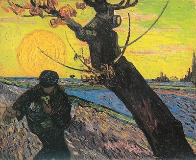 Vielleicht kennen Sie dieses Bild: Dargestellt ist ein Bauer, der in einer großen Armbewegung Samen auf das Feld streut; direkt über seinem Kopf leuchtet in reinem Gelb ganz groß die Sonne und quer über das Bild erstreckt sich ein knorriger Baumstamm, der das Bild teilt.