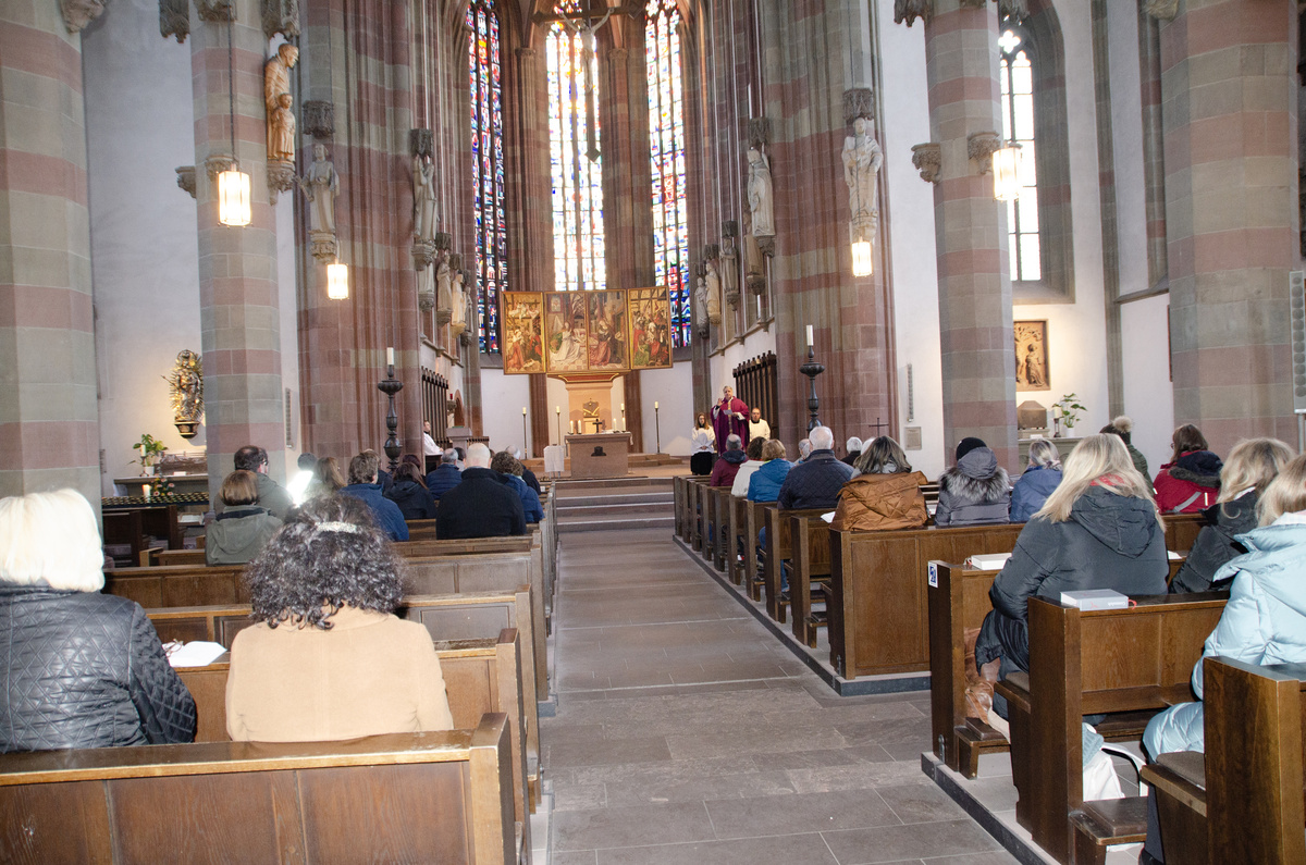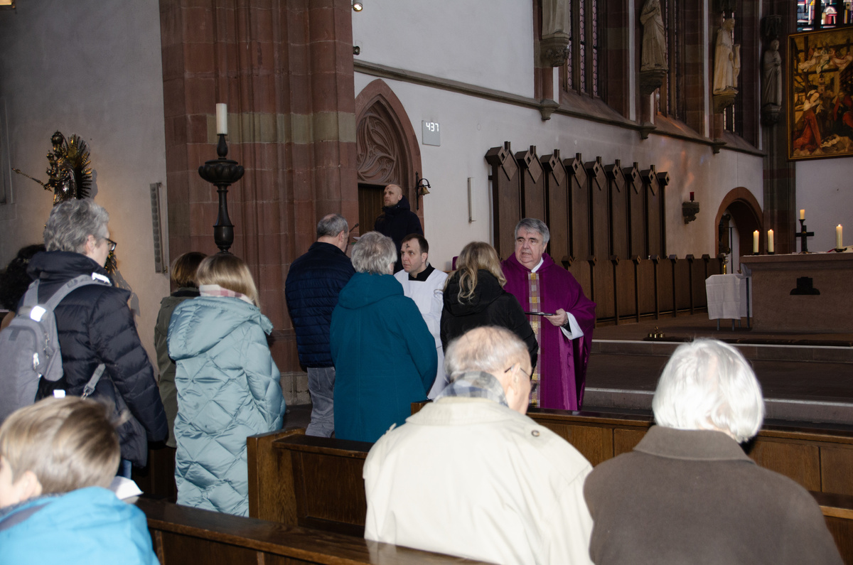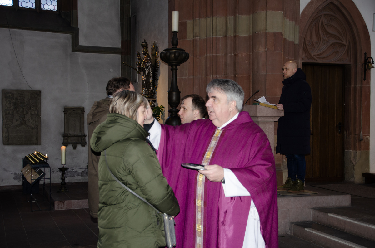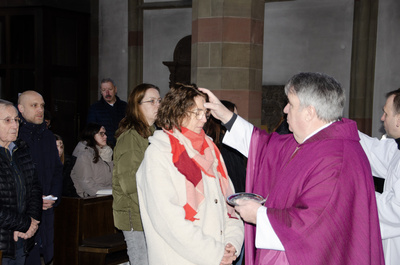 Bei der morgendlichen Messe in der Marienkapelle am Würzburger Marktplatz ließen sich die Mitarbeiterinnen und Mitarbeiter des DiCV und seiner Einrichtungen anschließend die gesegnete Asche auflegen. Domkapitular Clemens Bieber zeichnete ihnen dazu am ersten Tag der Fastenzeit das traditionelle Aschekreuz mit den Worten „Kehr um und glaub an das Evangelium!“ auf die Stirn. Während die vielen Mitarbeitenden nach vorne gingen, sang der Caritaschor unter der Leitung von Angela M. Lixfeld, der die Gemeinschaftsmesse musikalisch begleitete: „Bekehre uns, vergib die Sünde, schenke Herr uns neu Dein Erbarmen.“ Im Anschluss daran trugen mehrere Kolleginnen und Kollegen Texte zur Besinnung vor.