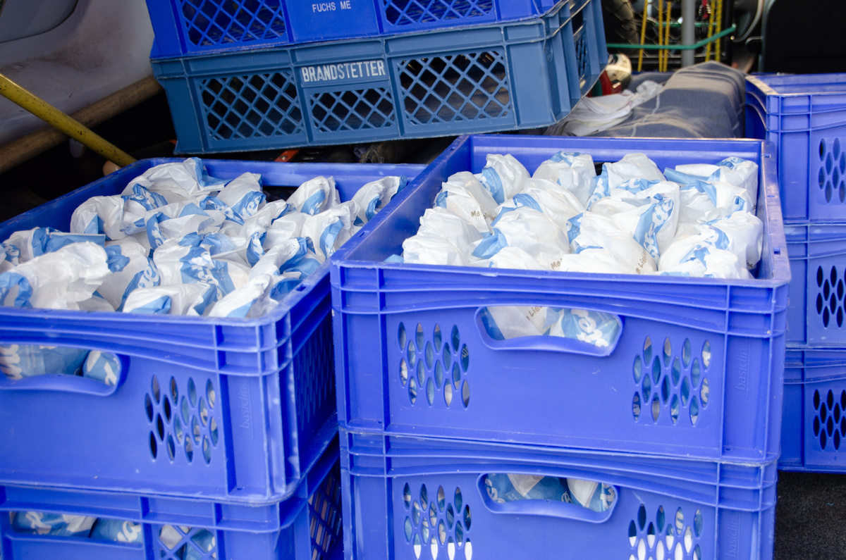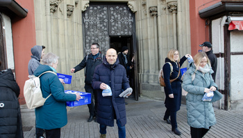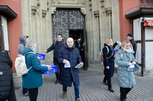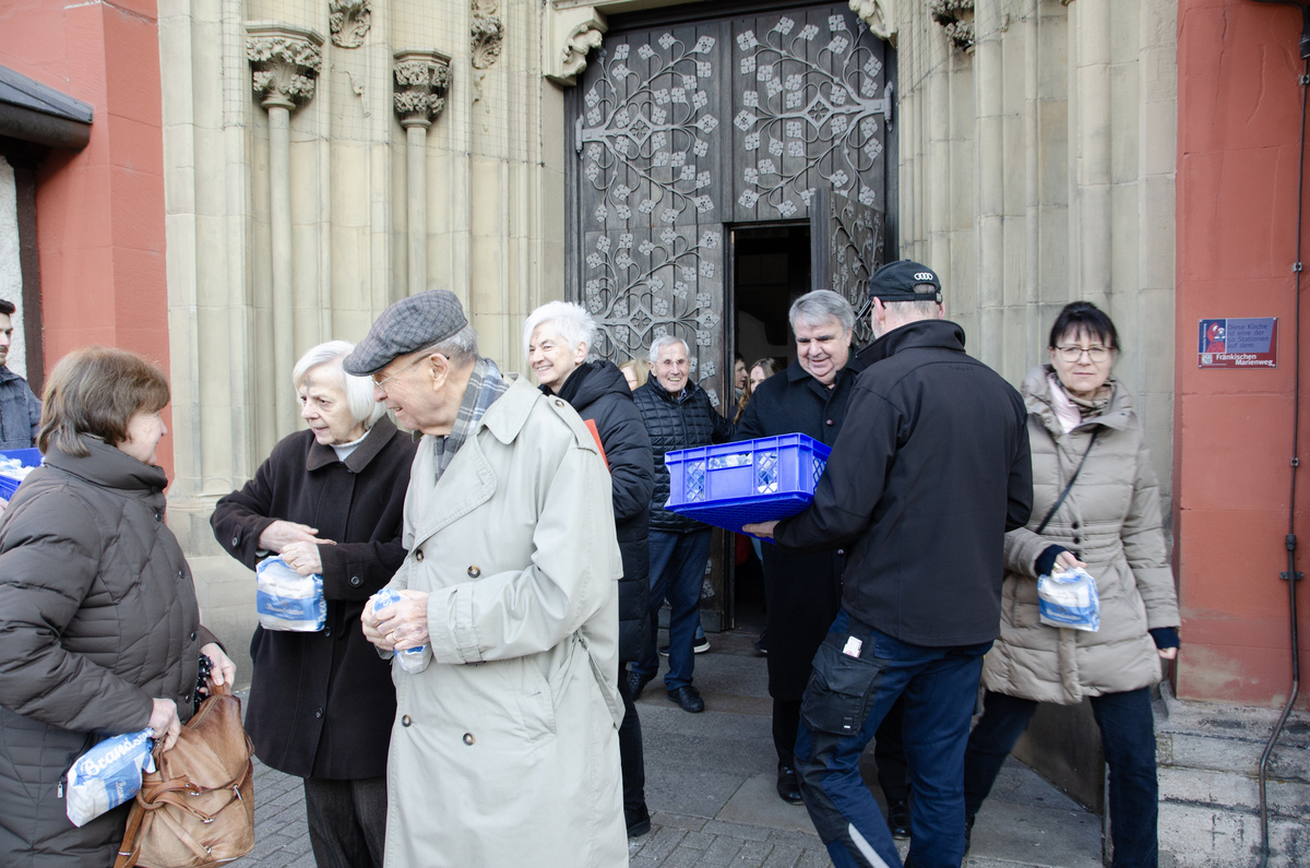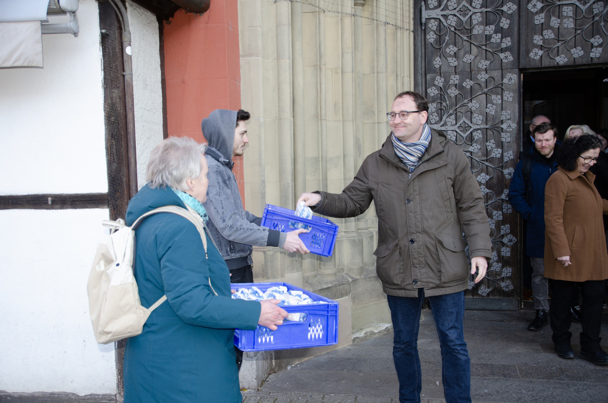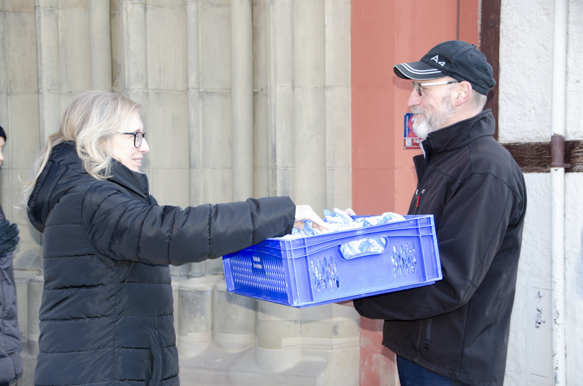 Traditionell verteilten im Anschluss noch Domkapitular Clemens Bieber, Hausmeister Alfred Krafft, sein Sohn Lukas Krafft und Mitarbeiterin Marion Wagner vor der Marienkapelle Frühstückstüten an alle, die die Mitarbeitenden mit in ihre Büros nehmen und sich den Inhalt dort schmecken lassen durften.