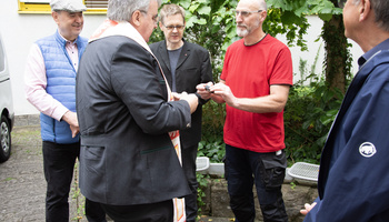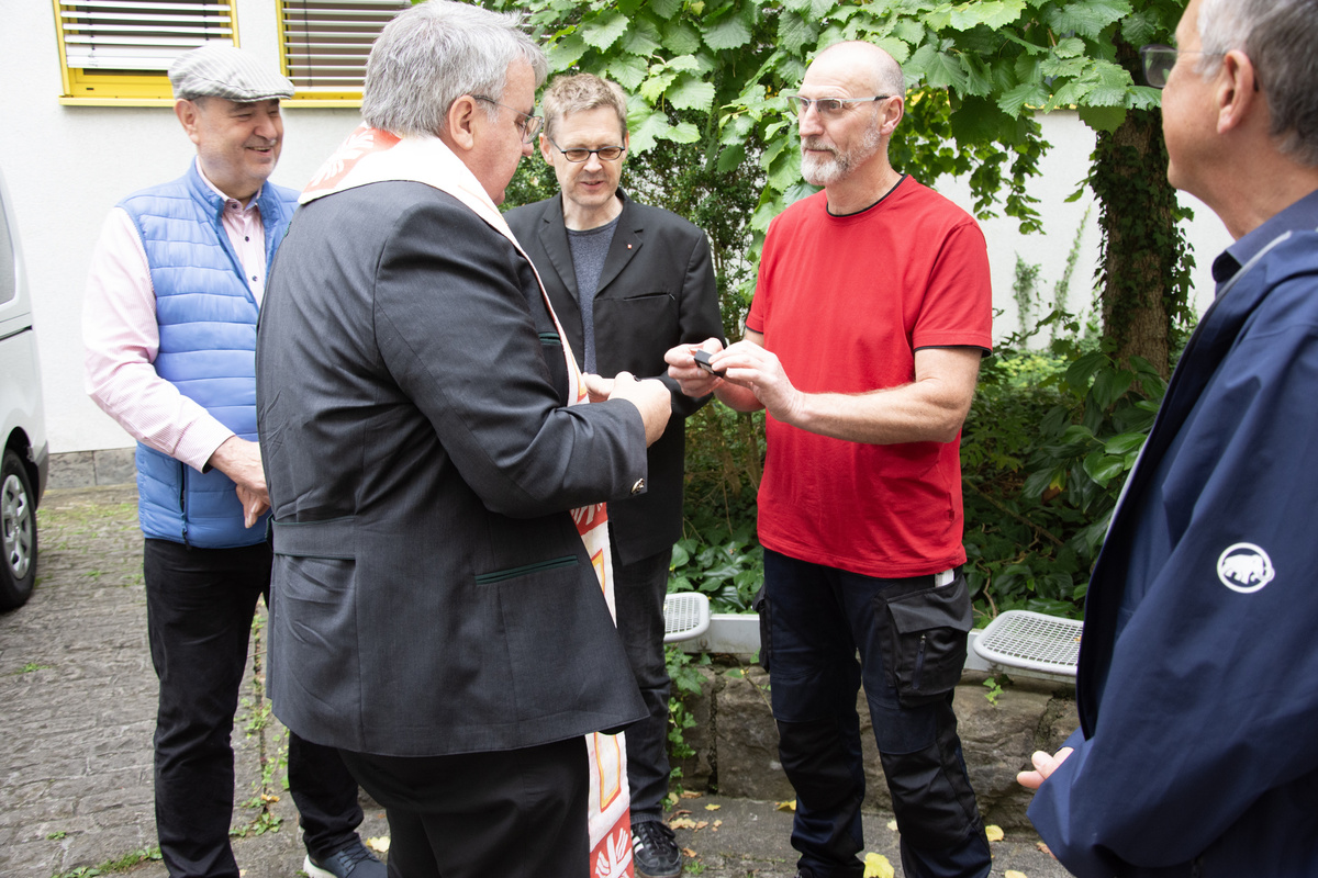 Für den Bus hatte Bieber eine kleine Plakette mit dem Abbild des heiligen Christophorus mitgebracht, die Hausmeister Alfred Krafft im Fahrzeug anbrachte. „Damit alle Mitarbeiterinnen und Mitarbeiter, die den Bus von nun an nutzen, sich behütet wissen und sicher an ihr Ziel kommen“, sagte er.