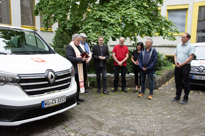 Über den neuen Neunsitzer sprach der Caritasvorsitzende anschließend Segensworte und benetze diesen mit Weihwasser. Mit einem gemeinsam gesprochenen Vater unser und der Anrufung an alle Heiligen, die die künftigen Insassen des Busses im Straßenverkehr beschützen sollen, ging die kurze Segnungsandacht im Innenhof zu Ende.