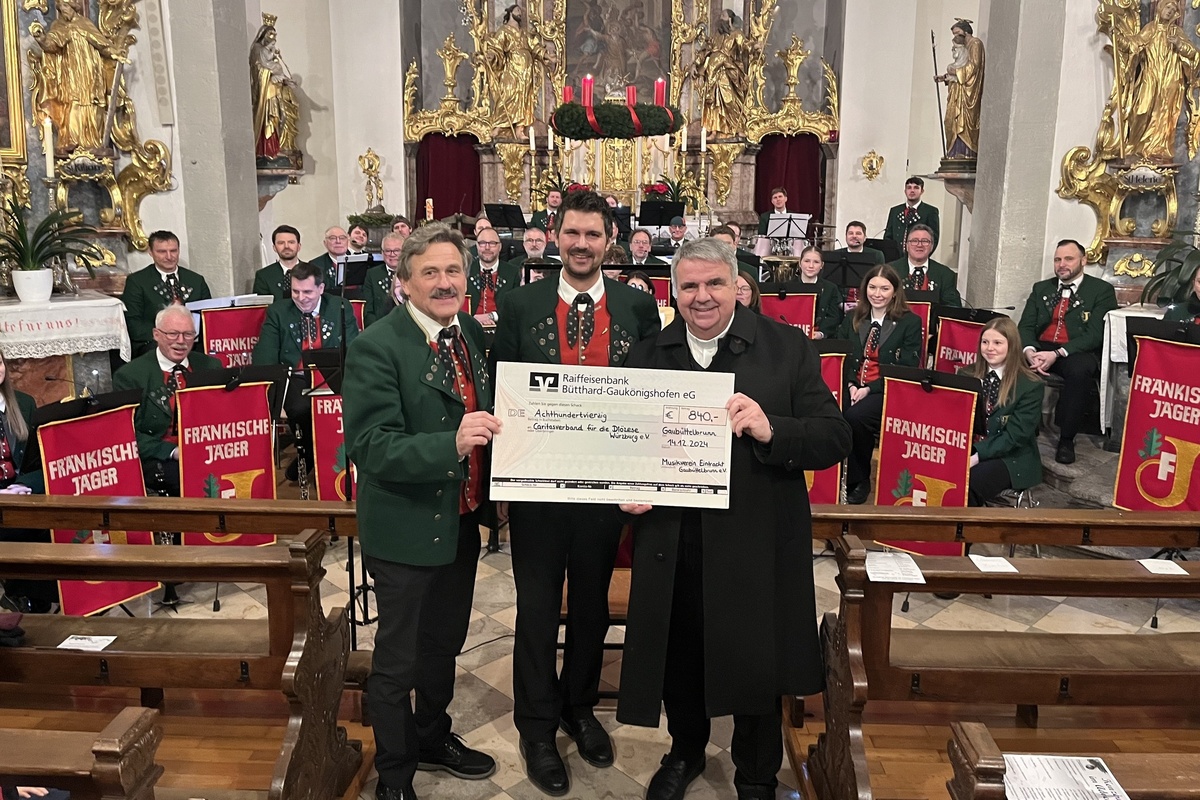 Am zweiten Adventssonntag gestalteten die „Fränkischen Jäger“ im Würzburger Neumünster ein Adventskonzert. Domkapitular Msgr. Dr. Stefan Rambacher bereicherte das musikalische Progamm mit geistlichen Impulsen. Die vielen Zuhörerinnen und Zuhörer spendeten sowohl Applaus als auch eine finanzielle Gabe. Insgesamt 840 Euro kamen zusammen, die nun beim Konzert in Gaubüttelbrunn vom Vorsitzenden des Vereins Thomas Haaf und Dirigent Lothar Heim an Domkapitular Clemens Bieber, Vorsitzender des Caritasverbandes für die Diözese Würzburg e. V., zur Unterstützung des Dienstes der Bahnhofsmission übergeben wurden. Der Caritasvorsitzende dankte den Musikerinnen und Musikern für die Einkehr, die mit dem Konzert in der Pfarrkirche bereitet wurde, und für die Einkehr, die den Menschen in der Bahnhofsmission mit vielerlei Hilfen bereitet werden kann.
