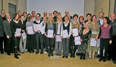 Bamberg/Würzburg, 8.1.2007: Nach dreijähriger Ausbildungszeit überreichte Dr. Hans Friedl vom Münchner Institut für Fort- und Weiterbildung (IFW) 21 Teilnehmer/innen des dritten Weiterbildungskurs "Systemische Elternarbeit" in der Zentrale des Caritasverbandes für die Erzdiözese Bamberg ihre Zertifikate als anerkannte Paar- und Familientherapeuten. Die Sozialpädagogen, Erzieher und Heilpädagogen kamen aus den Bistümern Bamberg, Würzburg und Augsburg.
