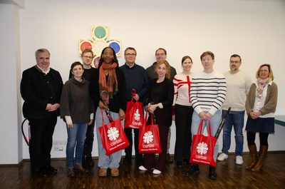 Die neuen Kolleginnen und Kollegen freuten sich anschließend über die roten Caritas-Taschen, die ihnen die zuständigen Abteilungsleiterinnen Angela M. Lixfeld und Sonja Schwab überreichten. Auch Sabine Werner schloss sich als stellvertretende Vorsitzende der Mitarbeitervertretung im DiCV dem Begrüßungsreigen an und hieß die neuen Mitarbeiterinnen und Mitarbeiter im Kreis der Kolleginnen und Kollegen mit einer Tafel Schokolade herzlich willkommen.