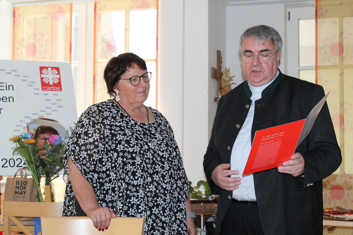 Auch Domkapitular Clemens Bieber war extra aus Würzburg gekommen, um Johanna Dietz das Caritaskreuz in Gold für ihre 45-jährige Tätigkeit bei der Caritas zu verleihen. Bei einem kleinen Imbiss im Anschluss wurden dann noch manche Geschichten und Erinnerungen ausgetauscht.