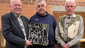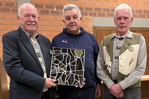 Das Küchenteam des Vereins hatte – wie in jedem Jahr – für alle Anwesenden ein leckeres Abendessen zubereitet. Der offizielle Teil der Versammlung begann mit dem Totengedenken und dem kräftig gesungenen „Englischen Gruß“: „Reinste Jungfrau, oh betrachte …“. Im umfangreichen Jahresrückblick nannte der Vorsitzende die erfreulich großzügigen Spenden, durch die in vielen Fällen die Aktivitäten des Vereins wie auch die Unterstützung von sozialen Projekten möglich wurden. Eugen Hain, eines der an diesem Abend neu in den Verein aufgenommenen Mitglieder, äußerte seinen Respekt für den Verein und dessen sinnvolles Engagement für das Gemeinwesen. Er dankte für die Aufnahme und überreichte ein in Blei gefasstes Glasbild mit der Darstellung des hl. Hubertus, das seinen Platz in der vom Verein errichteten Kapelle finden wird.