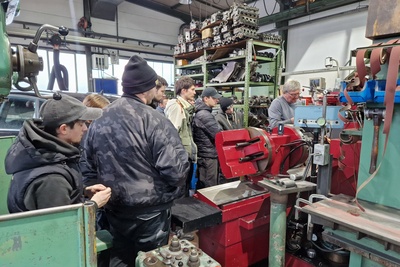 Der Besuch begann mit einer ausführlichen Einführung in die unterschiedlichen Arbeitsschritte, die für eine fachgerechte Motoreninstandsetzung nötig sind. Die beiden Brüder Richard und Burkard Wild führten die Gruppe durch die Werkstatt und erklärten die wichtigsten Prozesse.