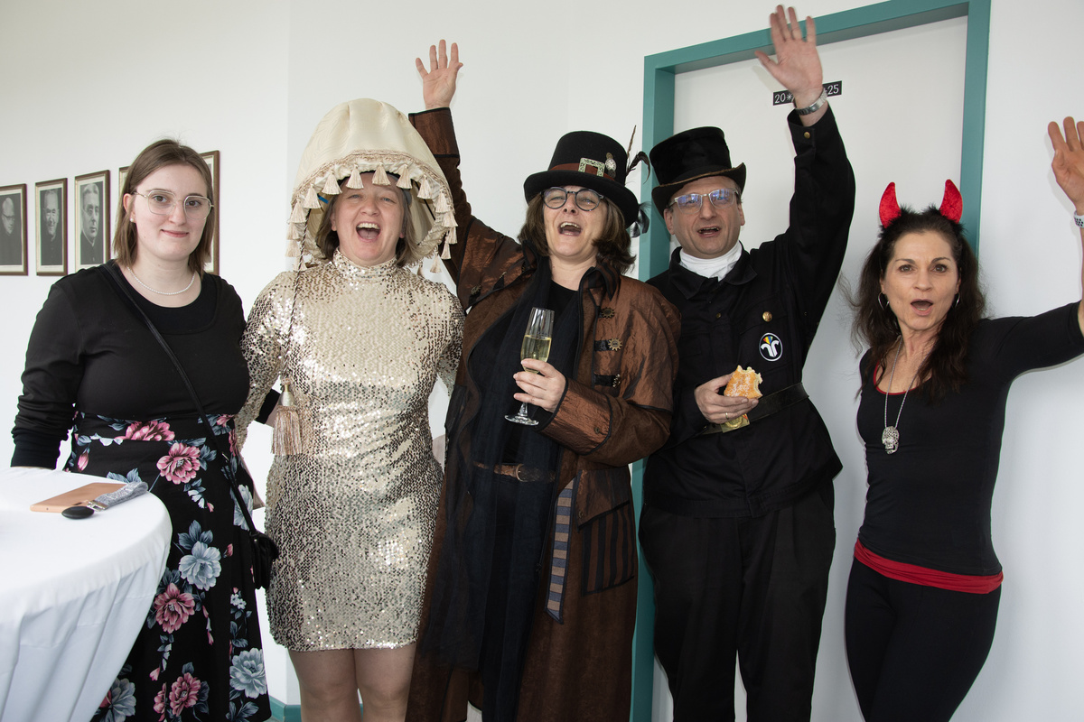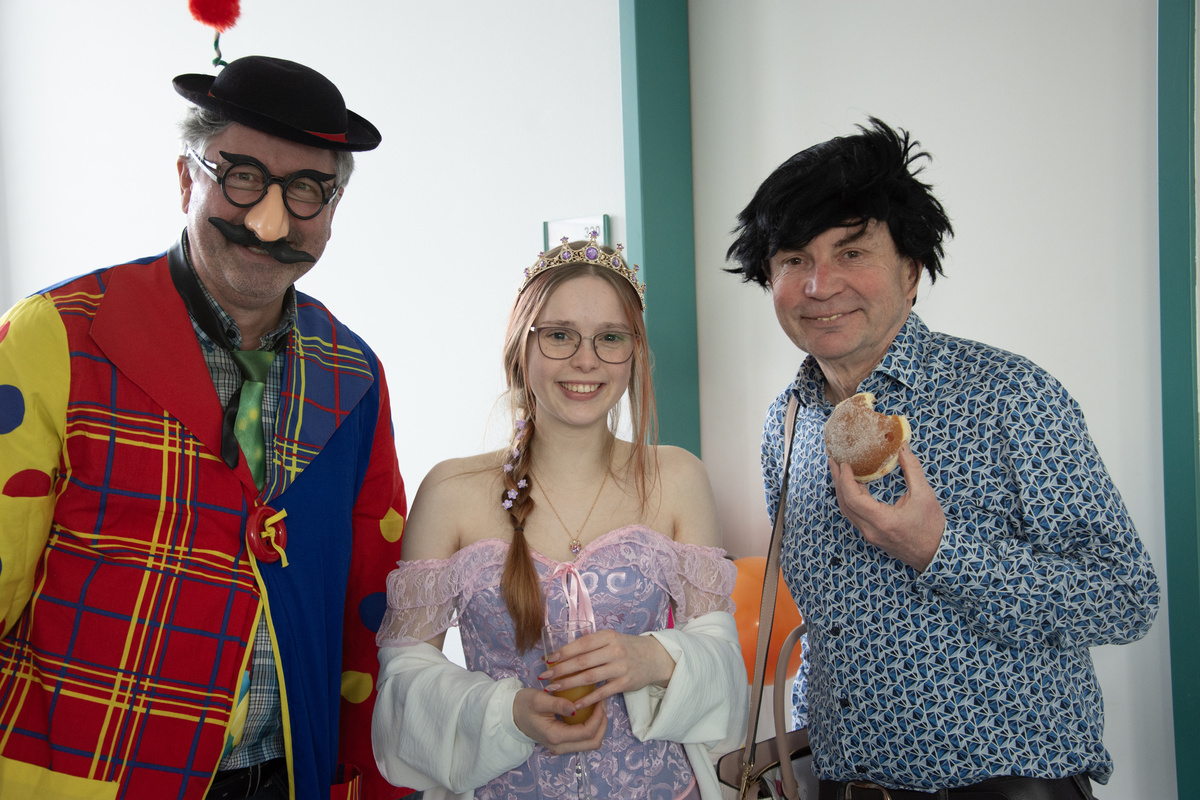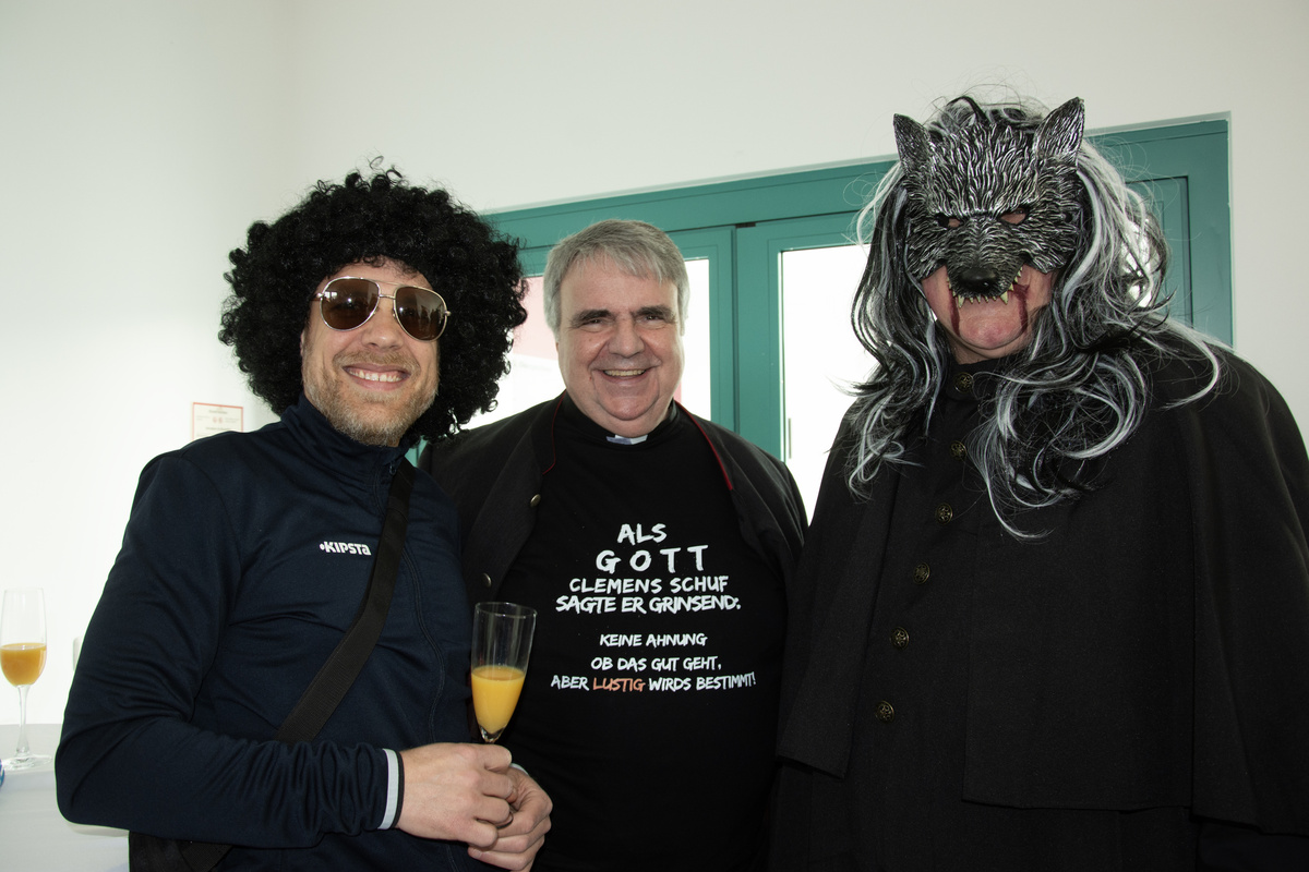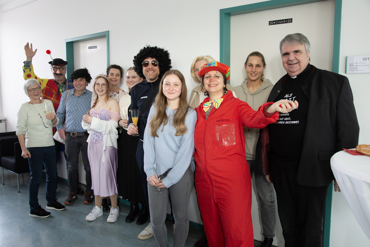 Mit Krapfen und Sekt haben die Mitarbeitenden der Geschäftsstelle im Würzburger Caritashaus den Ausklang der närrischen Zeit gefeiert. Auf Einladung von Domkapitular Clemens Bieber, Vorsitzender des Diözesan-Caritasverbandes, versammelten sich rund 80 Kolleginnen und Kollegen um die Mittagszeit am Faschingsdienstag im dritten Stock des Caritashauses, um vor Beginn der Fastenzeit noch einmal eine gemeinsame Pause einzulegen. In ausgefallenen und kreativen Kostümierungen, darunter viele Tiermotive wie Haie, ein Tintenfisch oder ein Wolf, wurde die traditionelle Faschingssause wieder zu einem bunten Fest für alle im Caritashaus. Vorsitzender Bieber freute sich, dass trotz der gerade andauernden Krankheitswelle so viele Mitarbeitende der Einladung des Vorstands gefolgt waren und es ein toller Faschingsausklang wurde.