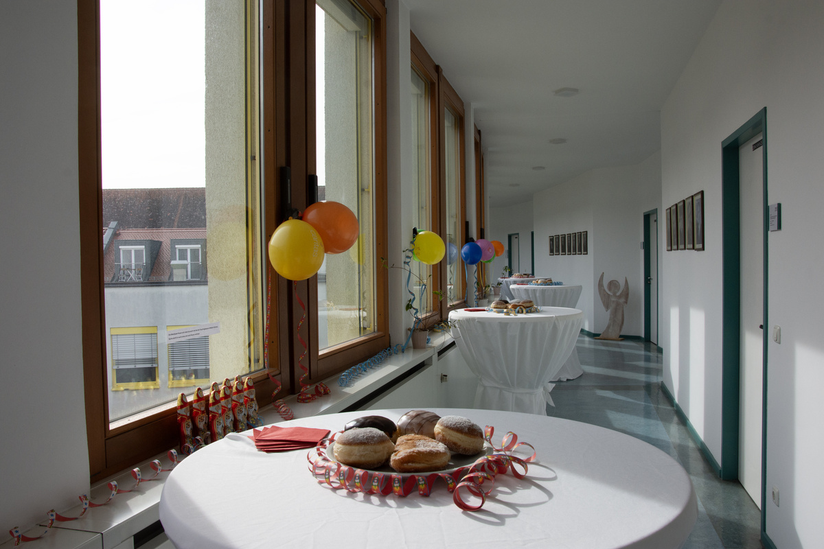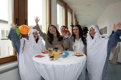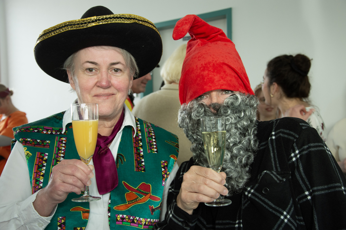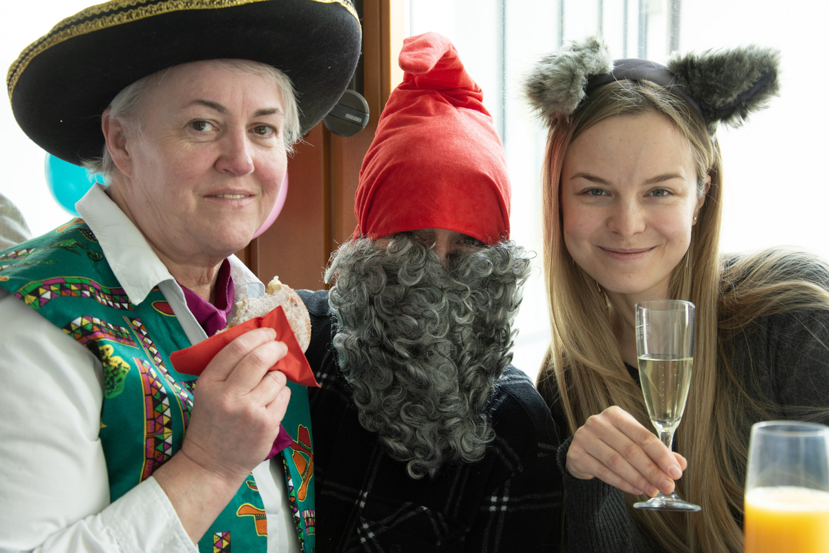Mit Krapfen und Sekt haben die Mitarbeitenden der Geschäftsstelle im Würzburger Caritashaus den Ausklang der närrischen Zeit gefeiert. Auf Einladung von Domkapitular Clemens Bieber, Vorsitzender des Diözesan-Caritasverbandes, versammelten sich rund 80 Kolleginnen und Kollegen um die Mittagszeit am Faschingsdienstag im dritten Stock des Caritashauses, um vor Beginn der Fastenzeit noch einmal eine gemeinsame Pause einzulegen. In ausgefallenen und kreativen Kostümierungen, darunter viele Tiermotive wie Haie, ein Tintenfisch oder ein Wolf, wurde die traditionelle Faschingssause wieder zu einem bunten Fest für alle im Caritashaus. Vorsitzender Bieber freute sich, dass trotz der gerade andauernden Krankheitswelle so viele Mitarbeitende der Einladung des Vorstands gefolgt waren und es ein toller Faschingsausklang wurde.