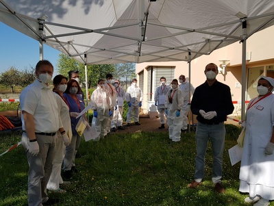 Letzte stellte auch die Freiwillige Feuerwehr Großostheim unter Beweis: 34 Kräfte unter Kommandant Thomas Domanig bauten ein Einsatzzentrum im Garten des Seniorenheims auf, sorgten für Schutzkleidung, halfen beim Räumen und Desinfizieren der Zimmer und beim Umzug der Bewohner. Bilanz von Kreisbrandrat Frank Wissel: „Ein sehr gelungener Einsatz aller Beteiligten: Feuerwehr, Pflegekräfte, Reinigungskräfte der Vinzenz-Werke.“