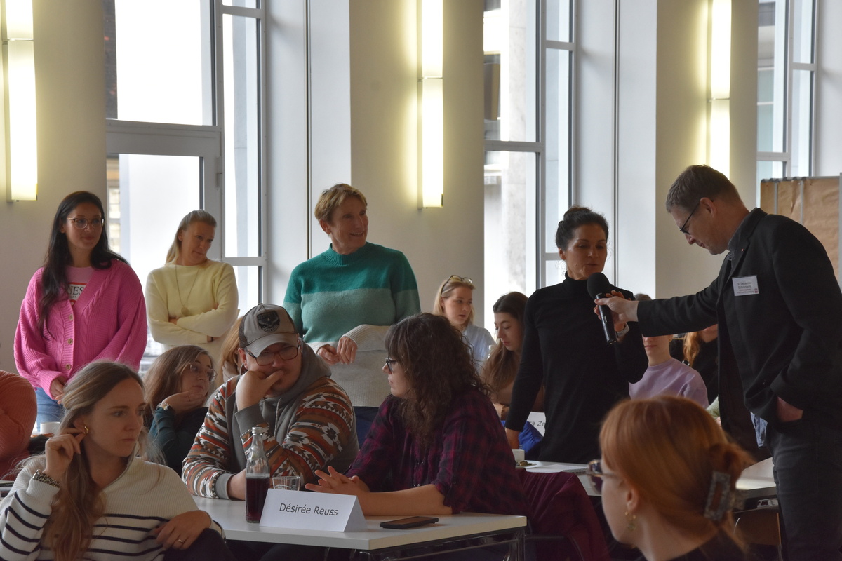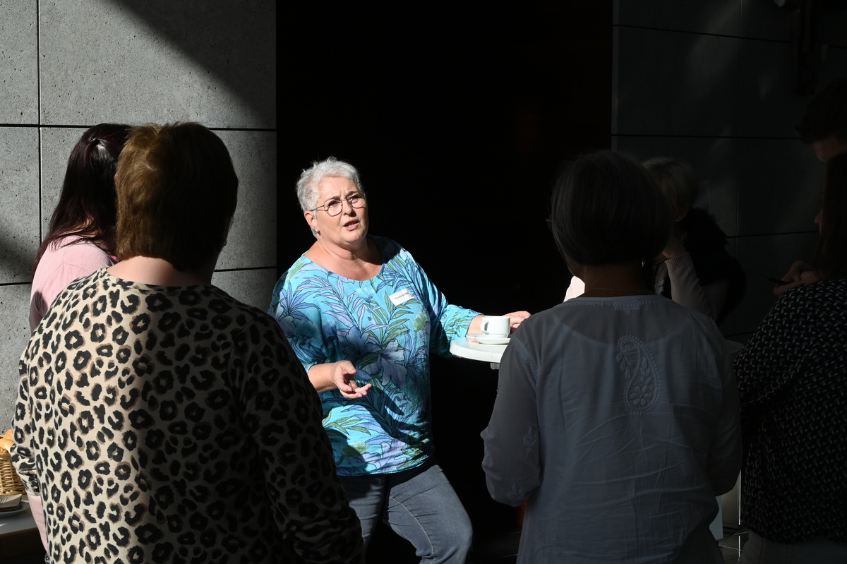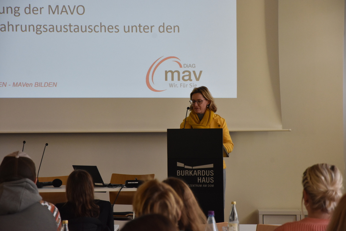 Dann ging es an das Inhaltliche. Um das breite Spektrum der Caritas sichtbar werden zu lassen, waren die Teilnehmenden des On-Boarding-Tages selbst gefragt. „Wer arbeitet in einer Kita, wer in der Verwaltung?“, waren nur zwei von vielen weiteren Fragen, die die neuen Kolleginnen und Kollegen beantworteten, indem sie sich von ihren Plätzen im Burkardushaus erhoben und kurz sich und ihren Arbeitsbereich vorstellten. „Sie sehen, Caritas ist kein Konzern, sondern Dienst am Menschen“, brachte es Koordinatorin Maria Wallrapp zusammenfassend auf den Punkt. Jeder Mitarbeitende der Caritas – ganz gleich, in welcher Position und in welchem Bereich er seinen Dienst tue – sei ein wichtiger Teil des großen Ganzen, um Menschen, die Unterstützung brauchen, helfen zu können.