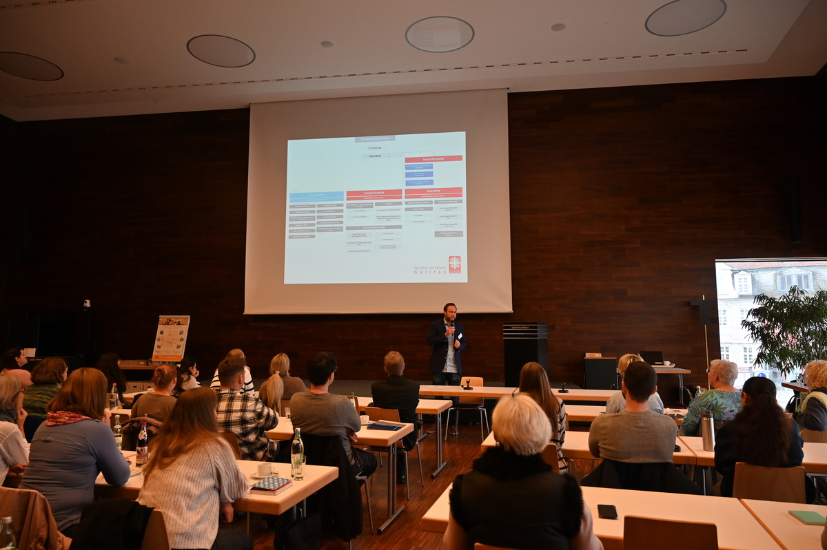 Um die Strukturen des Caritasverbandes für die Diözese Würzburg e. V. näher kennenzulernen, trat in Würzburg der Geschäftsführer des Caritasverbandes für die Stadt und den Landkreis Würzburg e. V., Stefan Weber, an das Mikrofon. Er gab den Teilnehmerinnen und Teilnehmern einen Überblick über die Aufgaben und Strukturen eines Orts- und Kreisverbandes (OKCV) im Diözesan-Caritasverband und erklärte, wie Subsidiarität im DiCV gelebt wird. „Es ist wichtig, dass wir uns als Verband verstehen, in dem wir für unsere Mitglieder solidaritätsstiftend unterwegs sind und Anwaltschaft für diese übernehmen“, erklärte Weber. Sein Appell: „Wenn Sie sehen, dass irgendwo etwas krumm läuft, wenden Sie sich gerne an Ihren jeweiligen OKCV.“