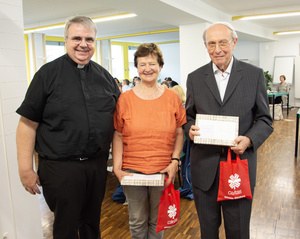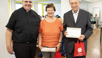 Neben vielen weiteren runden Geburtstagen wurden beim Gemeinschaftsfrühstück im Anschluss an die Gemeinschaftsmesse auch die beiden Jubilare und „Caritassenioren“ Elisabeth Rein und Antonio Lucchetta geehrt. Elisabeth Rein feierte gestern ihren 70. Geburtstag. Antonia Lucchetta ließ es sich nicht nehmen, sein heutiges 80. Wiegenfest gemeinsam mit seiner Frau bei den ehemaligen Kolleginnen und Kollegen im Caritashaus zu begehen. Beide erhielten von Domkapitular Clemens Bieber eine kleine Aufmerksamkeit in Form eines Bocksbeutels sowie von Martina König, Seniorenbeauftrage im Caritasverband, ein Geschenk.