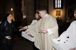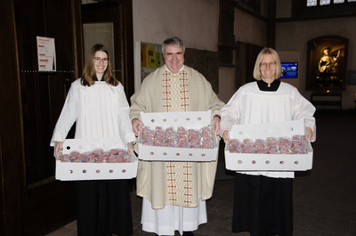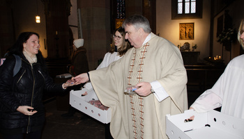 Caritas-Vorsitzender Bieber selbst nahm seinen Weihetag zum Anlass, die Kolleginnen und Kollegen am Ende des Gottesdienstes mit einer süßen Kleinigkeit zu überraschen und ihnen für ihr Mittun und Gebet zu danken. Er überreichte allen ein Plätzchen in Form eines rosafarbenen Herzens, über das sich die Mitarbeitenden sehr freuten und für das sie sich herzlich bedankten.