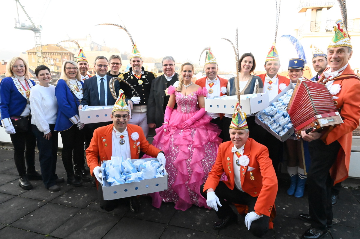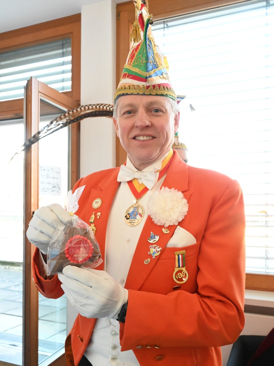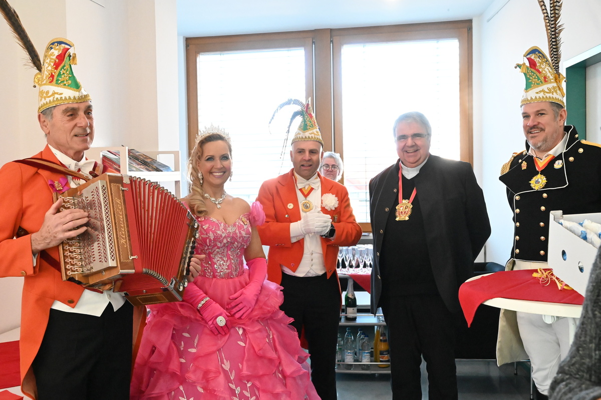 Für die Mitarbeiterinnen und Mitarbeiter der Caritas hatten die Narren süße Fastnachtskrapfen dabei. Für Bieber hatte das Prinzenpaar gar einen eigenen Orden mit der Aufschrift „Alex I. & Stephanie I. vom glitzernden Zahn“ mitgebracht. Kein Wunder, hatte Bieber doch tags zuvor den Gottesdienst der Karnevalisten in der Neumünsterkirche zelebriert.