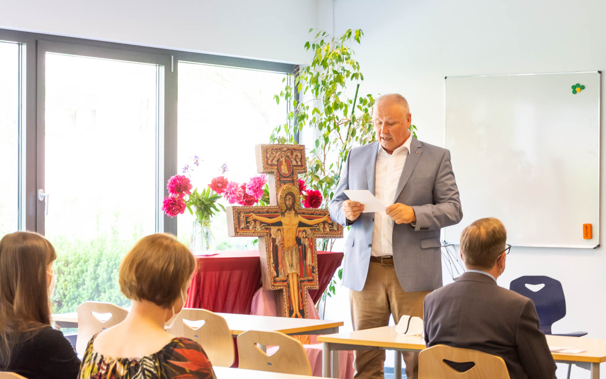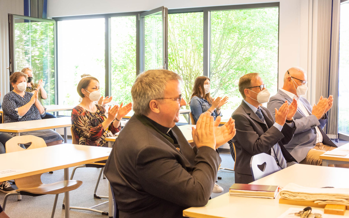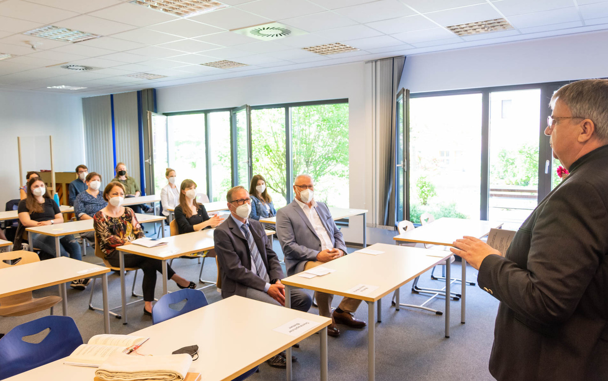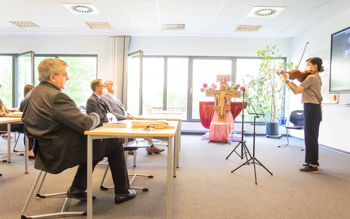 Einen kleinen, aber spürbaren Segen konnten die Teilnehmer unterdessen schon in der Feierstunde selbst erfahren. Bei den von Studierenden vorbereiteten Fürbitten kam es zu einem ungewöhnlichen Moment. „Die erste Bitte wurde tatsächlich schon erhört“, sagte ein sichtlich bewegter junger Mann, als er an der Reihe war. Er hatte eine Fürbitte vorbereitet, die darauf lautete, sich nach der langen Zeit der Trennung endlich wieder physisch begegnen zu könnten. Kurzerhand formuliert er seine Bitte daher um: Dass die Schulgemeinschaft der Berufsfachschule für Logopädie in ihren neuen Räumen lange und behütet zusammenbleiben möge.