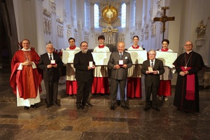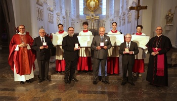 Für ihr vielfältiges ehrenamtliches Engagement in der Kirche von Würzburg hat Bischof Dr. Franz Jung am Montagabend, 7. Juli, beim Kiliani-Gottesdienst für Räte und Politiker Dr. Harald Ebert (Würzburg), Hans-Georg von Mallinckrodt (Gamburg), Professor Dr. Klaus Reder (Würzburg) sowie Norbert Baumann (Schweinfurt) im Namen von Papst Leo XIV. den päpstlichen Silvesterorden verliehen. „Ihr jeweiliges Engagement verdient unser aller Dank und Anerkennung. Als Bischof ist es mir daher eine große Freude, dass der Heilige Vater meinem Vorschlag entsprochen hat, Ihre Verdienste in besonderer Weise zu würdigen“, sagte der Bischof. Die Geehrten stünden zudem stellvertretend für viele im Bistum.