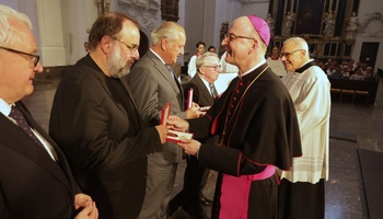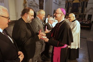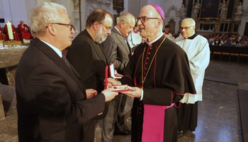 Für eine lebenswerte fränkische Heimat setzt sich Professor Dr. Klaus Reder seit Jahrzehnten ein. In mehr als 25 Jahren habe er durch die Schärfung des Bewusstseins sowohl für christliche Traditionen als auch für das jüdische Kulturerbe Frankens einen profilierten Heimatbegriff entwickelt, der selbstbewusste Rückschau mit Verantwortung für die Zukunft verbinde. Zudem habe Reder sich in vielfältigen kirchlichen Verbänden und Gremien engagiert, unter anderem fast vier Jahrzehnte im Diözesanrat der Katholiken. Von seinem Einsatz für die Heimat zeuge aber nicht zuletzt sein Wirken in der Gemeinschaft Sant‘Egidio seit 1983. „Als langjähriges Mitglied des Würzburger Ortsvorstands hat er nicht zuletzt durch erfolgreiches Fundraising die wertvolle Arbeit der Gemeinschaft für Menschen in Notsituationen mitgetragen und gefördert.“ Überregional sei er zudem 16 Jahre Vertreter seiner Gemeinschaft beim ZdK sowie ein Jahrzehnt lang Mitglied des Weltrats von Sant'Egidio gewesen. „Auf höchster Ebene war er hauptverantwortlich für die deutsche Beteiligung an den Weltfriedenstreffen der Gemeinschaft, zuletzt 2024 in Berlin.“ Reder habe gezeigt, was lebendige Kulturpflege sein könne. Seine wissenschaftlich stets fundierte Auseinandersetzung mit der Vergangenheit habe sich nie im Rückblick erschöpft, sondern sei immer Ausgangspunkt für die Gestaltung der Zukunft gewesen. „Die Vollendung der Bischofsreihe in der Germania sacra – übrigens als einziges deutsches Bistum – ist wesentlich Ihrer Förderung zu verdanken“, betonte der Bischof.