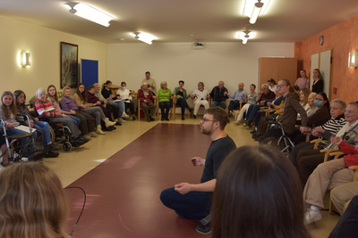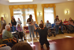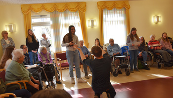 Während des insgesamt vierstündigen Workshops, lernten die Schülerinnen den Vortrag von klassischen Gedichten wie beispielsweise Schillers „Glocke“ oder „Es ist, was es ist, sagt die Liebe“ von Erich Fried durch die Weckworte-Technik für Menschen mit und ohne demenzielle Erkrankung. Das Gelernte wurde im Anschluss direkt für eine Gruppe von rund 15 Bewohnenden unserer Senioreneinrichtung St. Thekla angewendet. In einer knappen Stunde konnten die Schülerinnen ihr neues Wissen direkt anwenden, sich mit den Seniorinnen und Senioren austauschen und den betagten Gästen damit eine große Freude bereiten. „Das war sehr schön“, freute sich eine Bewohnerin sichtlich nach dem Workshop. Auch die Schülerinnen waren nach anfänglicher Zurückhaltung voll bei der Sache.