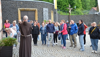 Vor Ort wurden die DiCV-Mitarbeiterinnen und Mitarbeiter vor der Kirche von Franziskanerbruder Korbinian Klinger, Seelsorger und Guardian des Hauses, herzlich begrüßt und in das Gotteshaus eingeladen. Dort weihte er die interessierten Zuhörerinnen und Zuhörer in allerhand Wissenswertes rund um den Kreuzberg und seine lange Geschichte ein. So habe der Kreuzberg in frühen Zeiten beispielsweise auch „Aschberg“ geheißen, was wohl auf den Kohleabbau, der hier in frühen Jahren stattgefunden hatte, zurückzuführen sei. Anhand von Bildern und sakralen Gegenständen ließ er die Kolleginnen und Kollegen außerdem daran teilhaben, wie die frühen Franziskanermönche, die aus dem Kloster in Dettelbach am Main, auf den Kreuzberg kamen, hier lebten, das berühmte Kreuzbergbier brauten, die vielen Wallfahrer betreuten und zum Teil auch beschwerliche Winter erlebten.