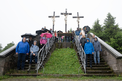 Eine zweite Gruppe der Mitarbeitenden hatte sich in der Zwischenzeit zu einer kurzen Wanderung rund um den Kreuzberg aufgemacht. Trotz strömenden Regens ließen sie es sich nicht nehmen, den Gipfel mit den drei bekannten Kreuzen zu erklimmen und sich dort zu einem gemeinsamen Erinnerungsfoto zu positionieren.