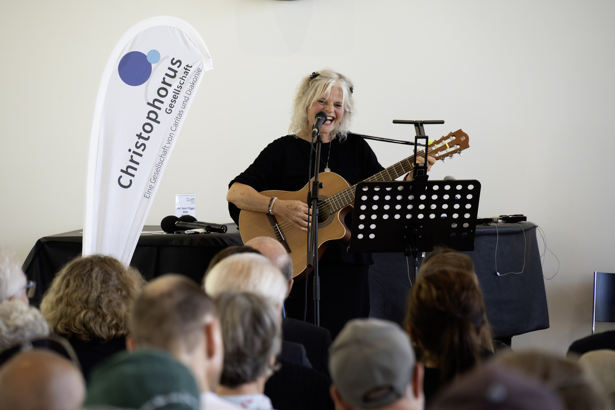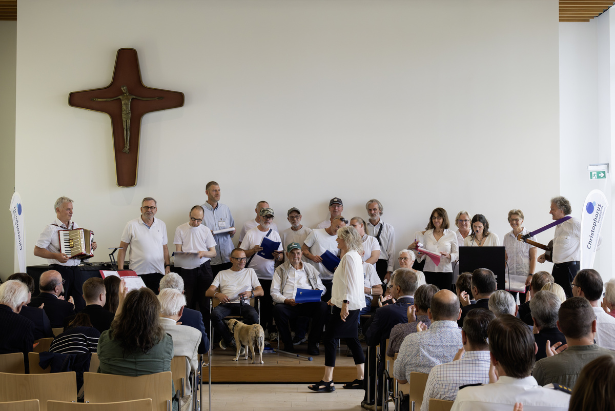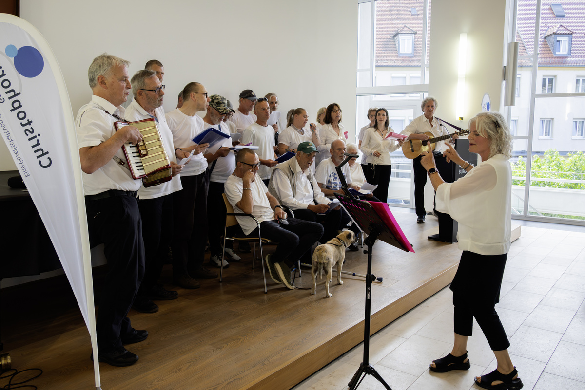 „Sie nennen sich die Wärmestubenrocker und hatten nur Zeit für drei oder vier Proben“, begrüßte Nadia Fiedler schließlich einen Spontanchor aus Mitarbeiterinnen und Mitarbeitern sowie Besucherinnen und Besuchern der Wärmestube auf der Bühne. Stimmungsvoll gratulierten sie, unter Leitung von Andrea Dehler, der Christophorus-Gesellschaft zum Geburtstag und sorgten für gute Unterhaltung. Es durfte kräftig mitgesungen werden.