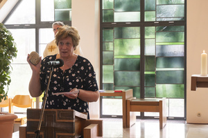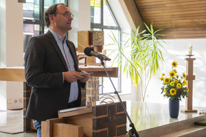 In der Tat sei der Simonshof der Caritas eine ganz besondere Einrichtung, unterstrich Domkapitular Clemens Bieber immer wieder während der ökumenischen Andacht, die er gemeinsam mit Pfarrerin Christine Dürr leitete. Es gebe viele materiell reiche Menschen in Unterfranken, griff Bieber einen aktuellen Artikel der MainPost auf. „Aber sind die zehn reichsten Menschen Unterfrankens auch die glücklichsten?“ Einen zwingenden Zusammenhang sehe er nicht, so Bieber. „Wer sich wertgeschätzt und geborgen fühlt, der ist zumeist auch glücklich“, so der Domkapitular in seiner Predigt. „Wir wollen am Simonshof Menschen zu ihrem Glück verhelfen.“ Dem neuen Leitungsteam bescheinigte Bieber: „Sie machen die Menschen glücklich mit ihrem Einsatz.“ Männer, die lange auf der Straße unterwegs waren, könnten hier erleben, dass Gott ihnen gute Menschen zur Seite stelle. Pfarrerin Dürr erachtete es als ein schönes Zeichen, dass der Simonshof in ihrem Pfarrgebiet liege. „Hier können wir etwas weitergeben von der Liebe Gottes.“
