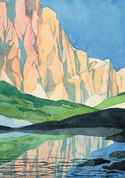 Das Aquarell des langjährigen Innsbrucker Bischofs Reinhold Stecher zeigt ein Bergmassiv im Rofangebirge in Tirol, das sich in einem See spiegelt. Im Psalm 121 heißt es: „Ich erhebe meine Augen zu den Bergen: / Woher kommt mir Hilfe? / Meine Hilfe kommt vom HERRN, / der Himmel und Erde erschaffen hat. / … Der HERR behütet dich vor allem Bösen, / er behütet dein Leben. / Der HERR behütet dein Gehen und dein Kommen …“ Diese Erfahrung möge Ihr Herz, Ihre Seele erfüllen und sich darin „spiegeln“!