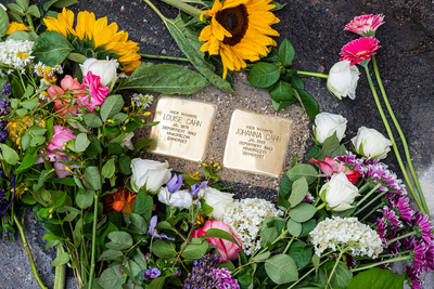 Schülerinnen und Schüler der 9. Klasse des Wirsberg Gymnasiums gestalteten die kleine Feier zur Verlegung der neuen Stolpersteine am Caritashaus. Mit Musik und Erinnerungen an Louise und Johanna Cahn brachten sich die Jugendlichen, die zugleich eine Patenschaft für die Stolpersteine übernahmen, ein. Sie hätten sich im Deutsch-, Geschichts- und Religionsunterricht intensiv mit dem jüdischen Leben und dem Nationalsozialismus beschäftigt, berichteten die jungen Leute und legten zum Gedenken Blumen an den neuen Stolpersteinen nieder.
