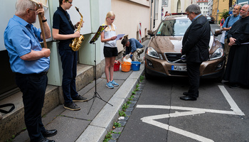 Clemens Bieber und Abteilungsleiter Andreas König vertraten die Caritas als unmittelbare Nachbarin der neuen Gedenkstätte. Wo genau sich der Eingang zum Haus „Franziskanergasse 3 ½“ in den 1930er Jahren befunden habe, lasse sich nicht mehr mit Sicherheit feststellen, hieß es aus dem Kreis der Engagierten um Benita Stolz. Deshalb habe man die Steine an der Grenze wischen den Hausnummern 3 und 5 „schräg“ verlegt.
