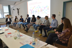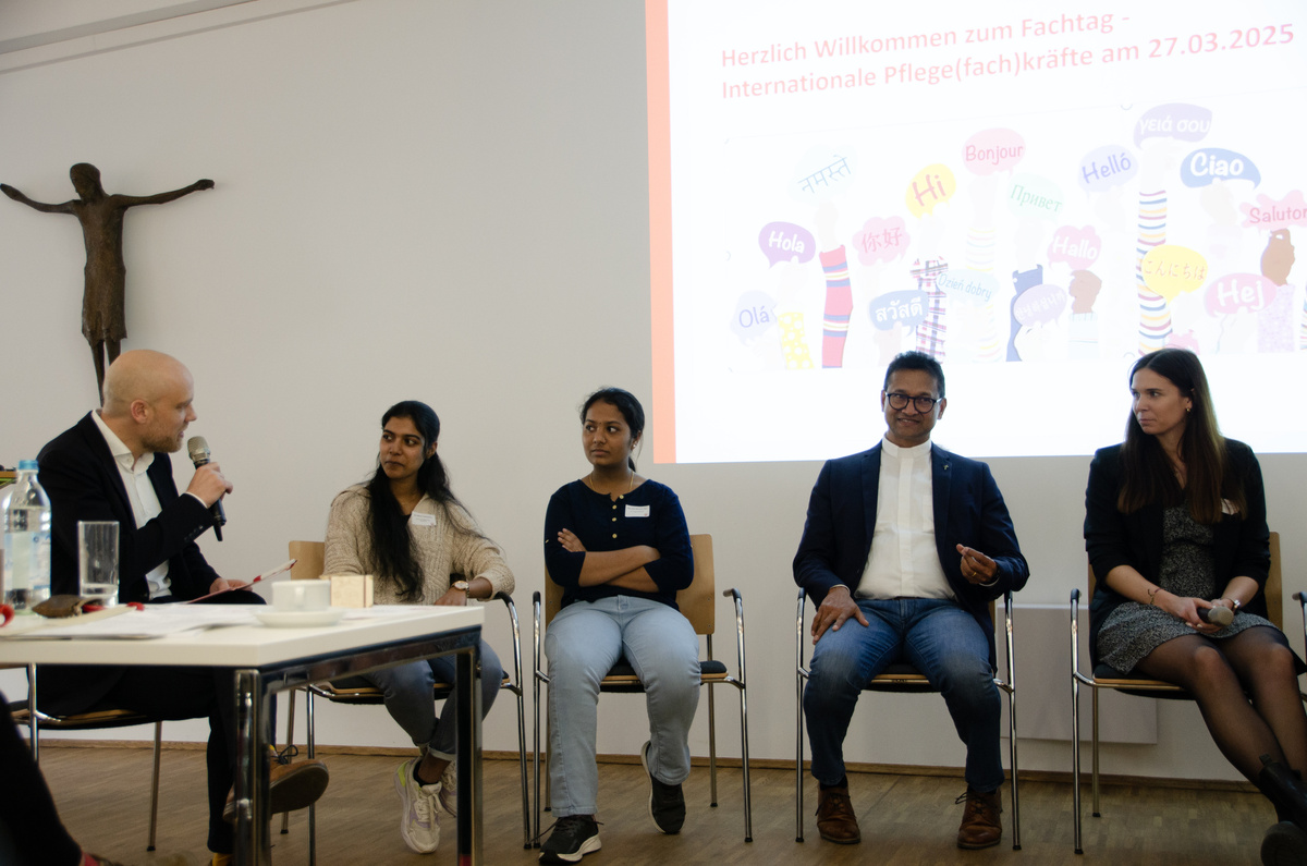 Den Fachtag beschlossen dann Best-Practice-Erfahrungsberichte, die im Rahmen eines Expertenkreises vorgestellt wurden. Dazu interviewte Moderator und CEG-Geschäftsführer Georg Sperrle unter anderem zwei junge Frauen aus Indien, die seit September letzten Jahres eine Ausbildung zur Pflegefachkraft in zwei Würzburger Caritas-Einrichtungen absolvieren. Ann Maria Thankachan, Azubi im Bischof-Scheele-Haus Würzburg, schilderte eindrücklich, warum sie sich für die Ausbildung in Deutschland entschieden hat: „Deutschland ist ein tolles Land. Hier kann ich – anders als in meinem Heimatland Indien – als Frau in Freiheit leben.“ Dem stimmte ihre Kollegin Neha Biju Mohanan Biju, Auszubildende in St. Thekla, zu. Auch die Aussicht auf eine gute Ausbildung, die angemessene Bezahlung und die tolle Organisation, das Willkommenheißen und die Begleitung durch das Team der CEG, allen voran durch Amelie Dürr und Susanne Scheiner, seien ausschlaggebende Beweggründe für sie gewesen, Indien zu verlassen. Philippinin Carlyn Loi Andrada, die seit etwa neun Monaten als Fachkraft in Anerkennung im Marienheim Würzburg tätig ist, schilderte aus ihrer Sichtweise als gelernte Krankenschwester, wie sie ihren neuen Arbeitsalltag erlebt: „Meine Kolleginnen und Kollegen sind sehr herzlich und erklären Dinge, die ich aufgrund der Sprachbarriere vielleicht nicht verstanden habe, einfach noch einmal. Danke dafür.“ Dennoch sprach sie auch die Herausforderungen, mit denen sie konfrontiert sei, offen an. Der Weggang aus ihrem Heimatland, die Trennung von ihrem Lieben und die vielen neuen Dinge, die sie lerne, seien eine große Aufgabe für sie.